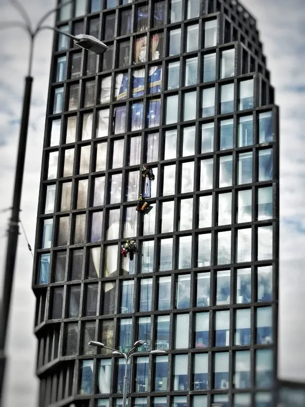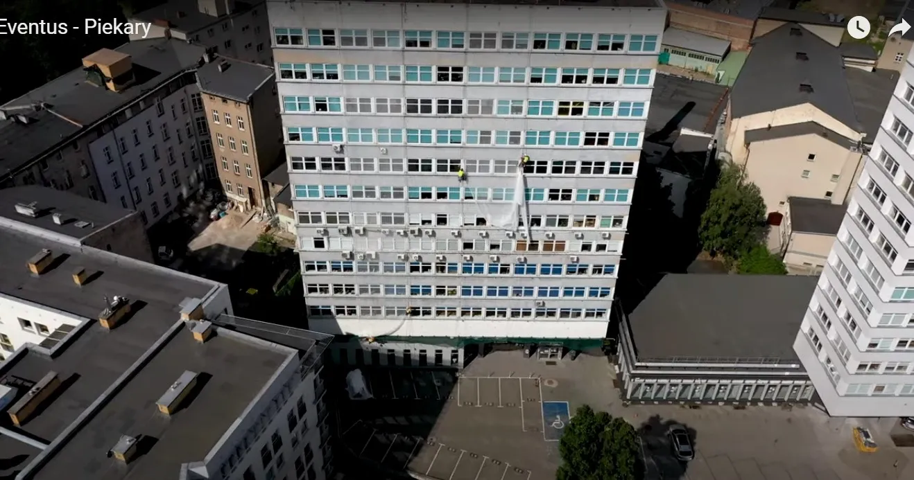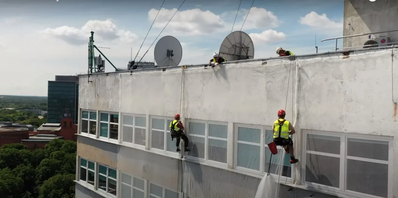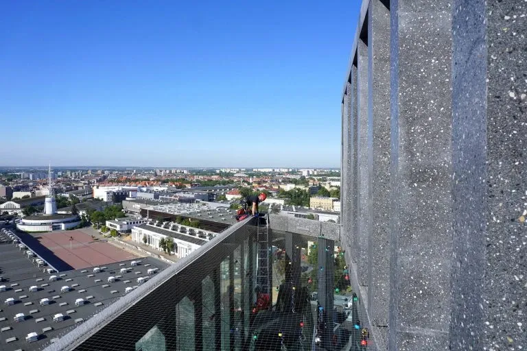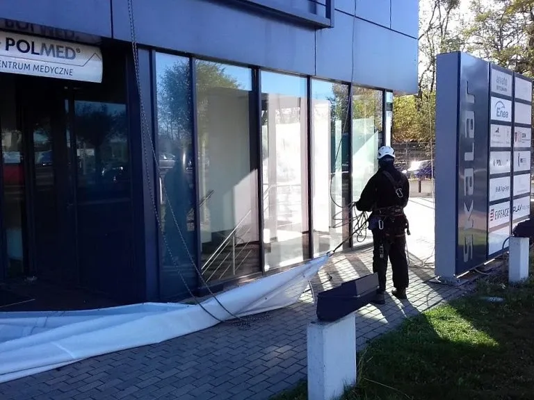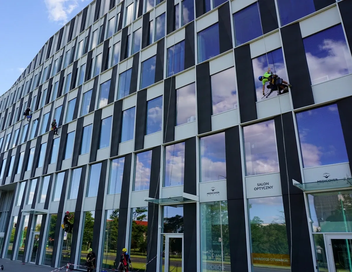 Mycie elewacji wieżowca Bałtyk w Poznaniu, wraz z usuwaniem zacieków z mleczka wapiennego oraz impregnacją szyb