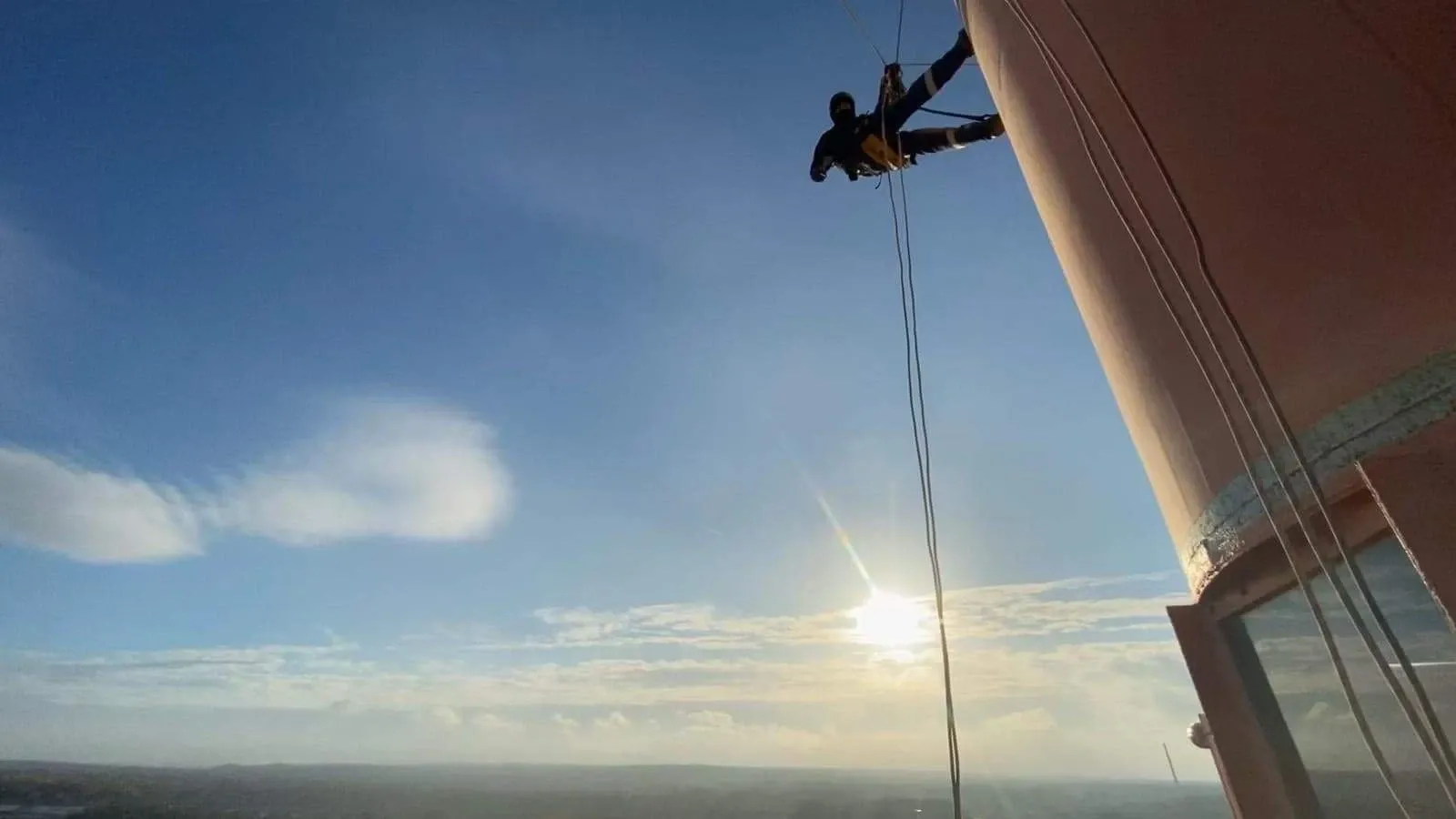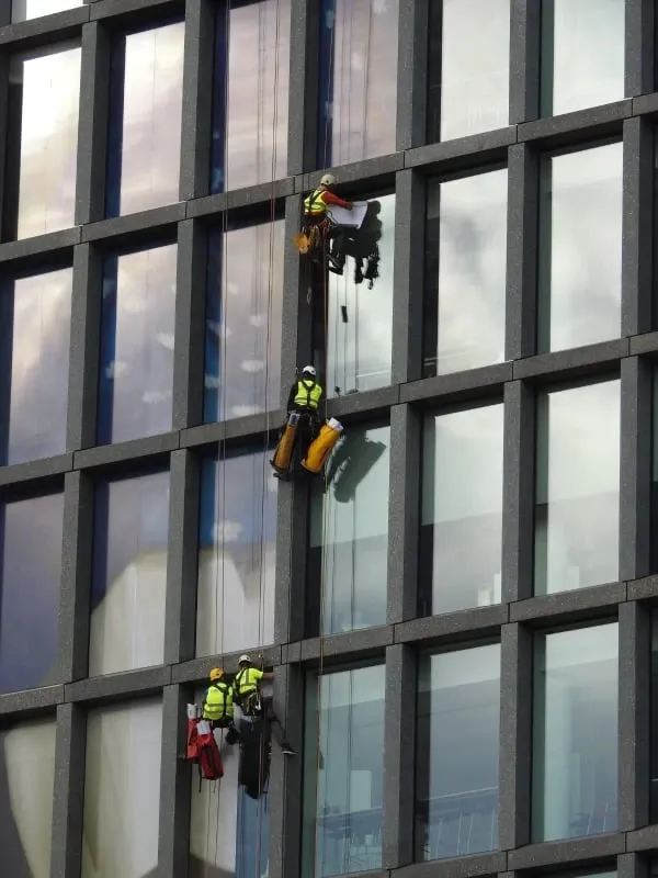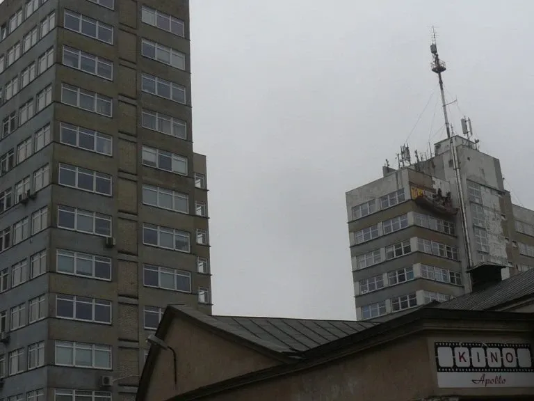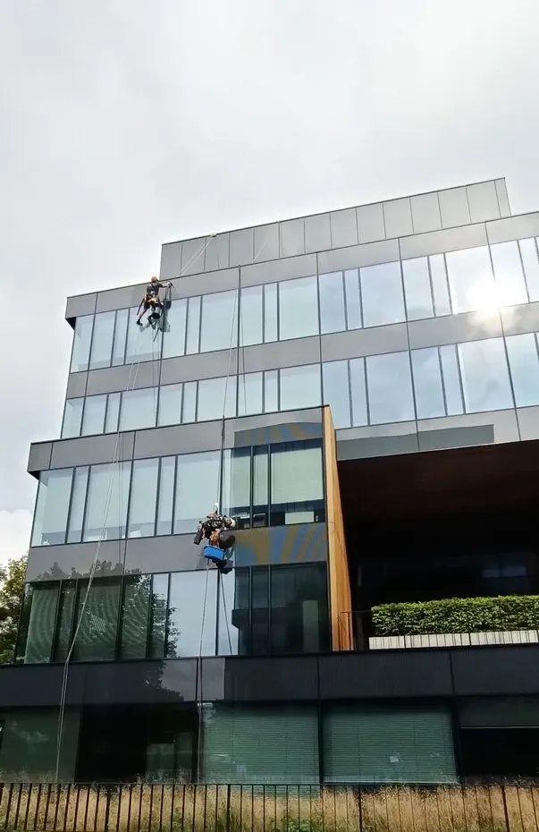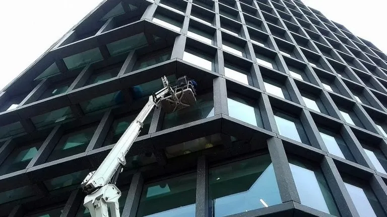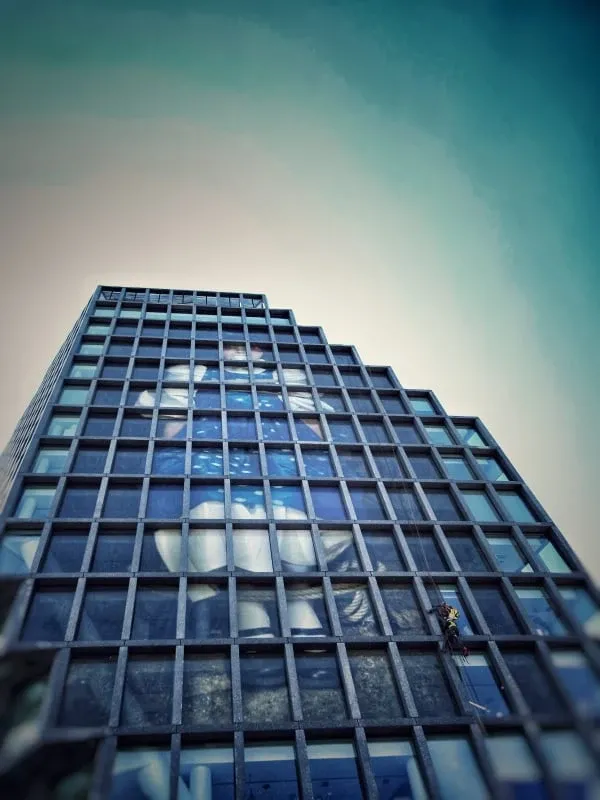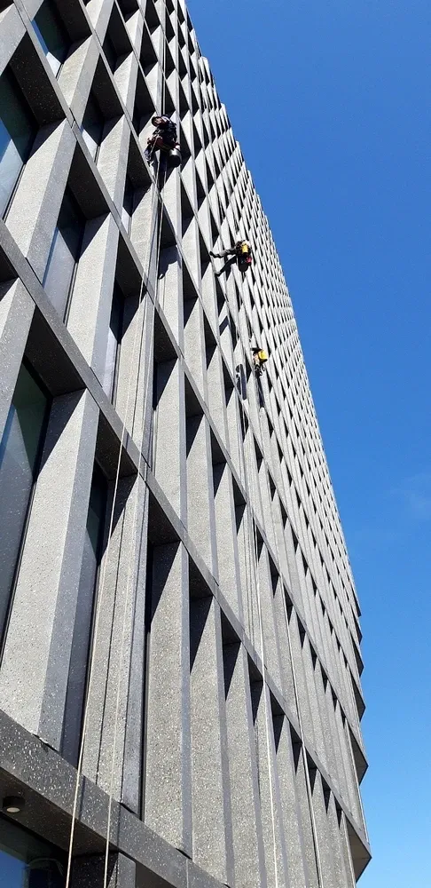 Mycie elewacji wieżowca Bałtyk w Poznaniu, wraz z usuwaniem zacieków z mleczka wapiennego oraz impregnacją szyb