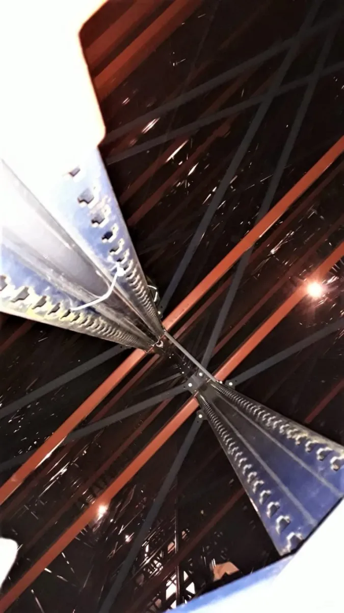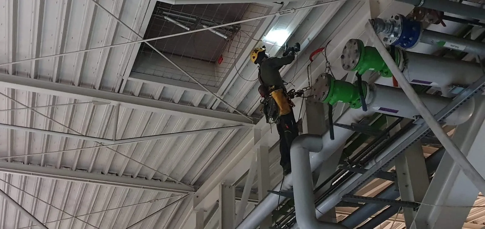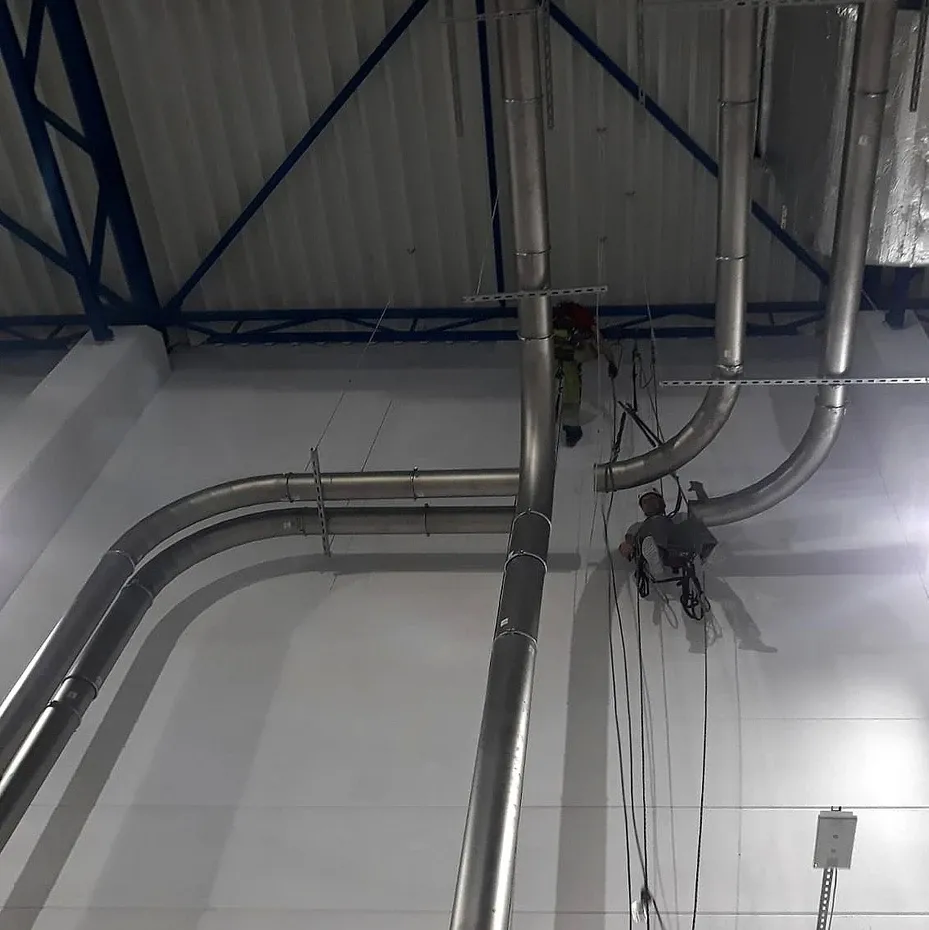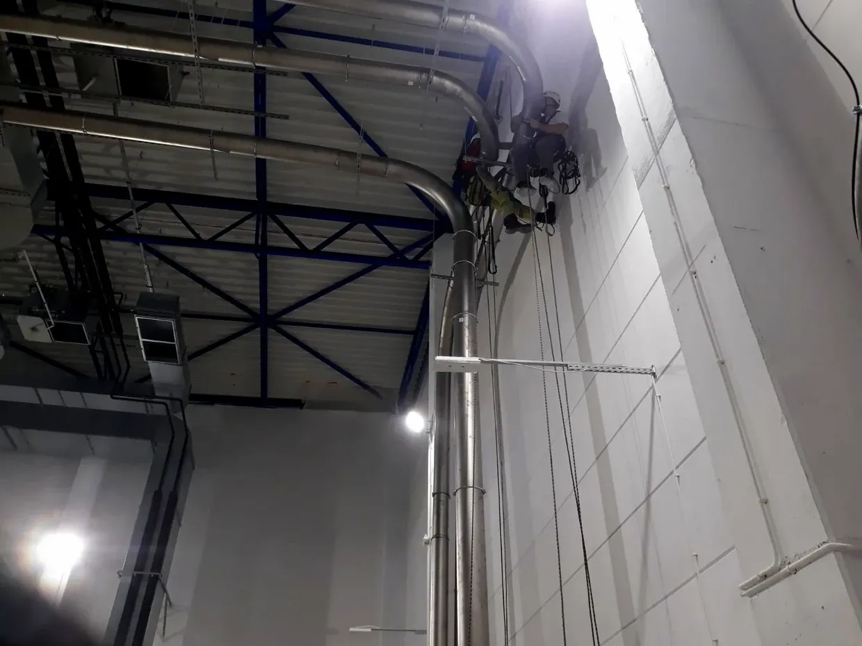 Montaż elementów systemu detekcji dymu – rur zasysających na terenie magazynu wysokiego składowania