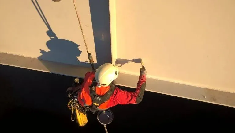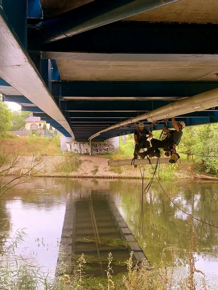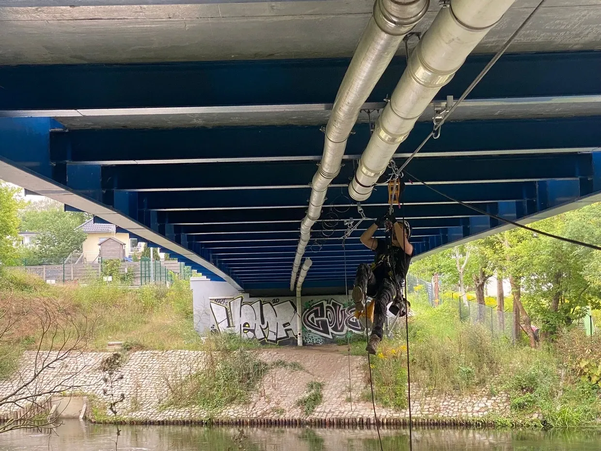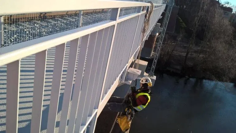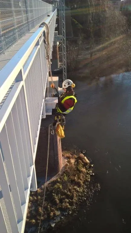 Most Starołęka – malowanie pasa dolnego blachownicy mostu, wyprawki na pylonie mostu