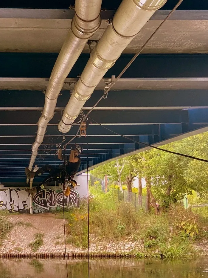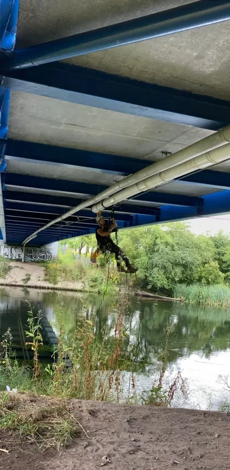 Montaż kolektora pod mostem nad rz. Brdą